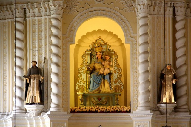 教堂內祭壇的玫瑰聖母雕像更是漂亮,讓人驚歎不已;