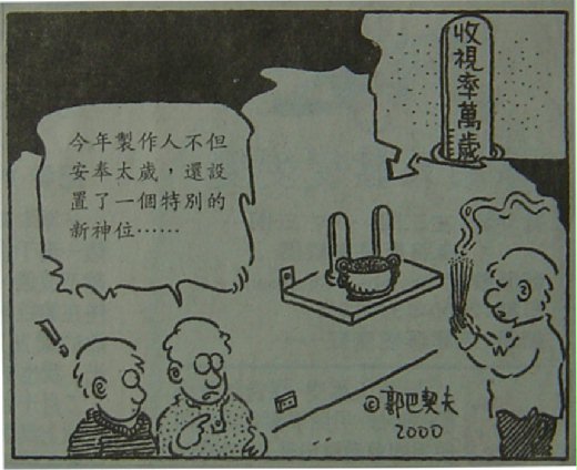 ▲這幅單格影劇漫畫〈新神位〉,是我七年前的作品,2000年3月16日星期四,刊登在《星報》影劇版。那時的郭俊麟36歲。