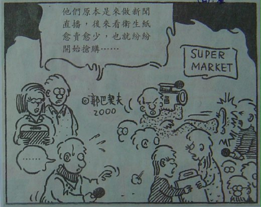 ▲這幅單格影劇漫畫〈新聞直播〉,是我七年前的作品,2000年3月19日星期日,刊登在《星報》影劇版。那時的郭俊麟36歲。