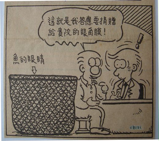 ▲這幅單格醫藥漫畫〈眼角膜〉,是我十五年前的作品,1992年4月27日,刊登在《自立晚報》醫藥版。那時的郭俊麟28歲。