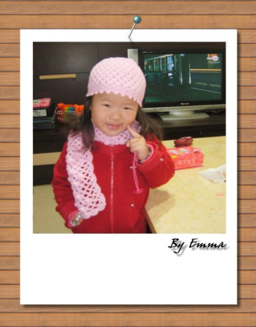 今天回娘家,正好拍拍前幾天完成的粉紅色手鉤帽&鏤空圍巾。^^"