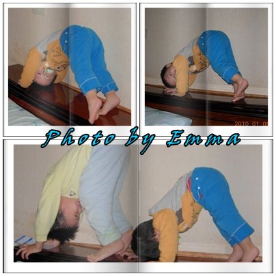 昨晚的把戲是:爬上床頭櫃...然後...頭頂著床頭櫃,屁股翹老高...