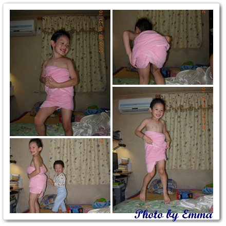 昨晚,剛洗好澡的哥哥,在等弟弟穿衣服的空檔。