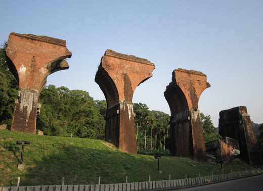 「龍騰斷橋」橋面離地約50公尺,是全台山線鐵路最高的橋樑,此座橋墩沒用一根鋼筋,一包水泥,只用紅磚塊及花崗石塊平衡及火車行駛時有吸震功能。