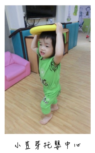 看似簡單的海綿飛盤在每位小朋友手中卻有不同的看法,有人當帽子來戴在頭上,有的則當成汽車方向盤,小荳芽托嬰中心表示:「即使平凡無奇的物品落到他們手中,都有可能創造出價值來,因此,給小朋友接觸各式各樣道具,都是有目的地讓他們學習。」