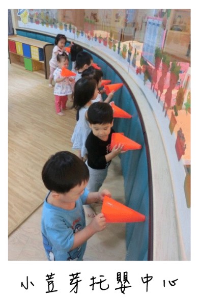 「大家紛紛靠邊排排站,這圓錐該怎麼使用呢?開始悉悉簌簌討論了起來……」圓錐在一般人眼中只有警示的作用,然而,在他們眼前所看的會是什麼呢?小荳芽托嬰中心希望在這上課的小朋友,每天都能體驗不一樣的事物,帶給他們愉快的學習回憶。