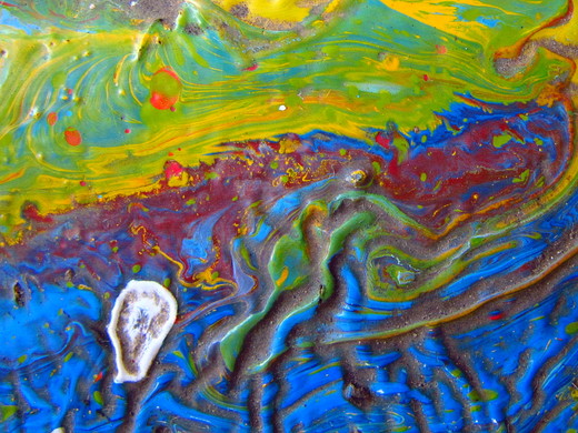 在一所學校圍牆壁畫下方滲溢的自然流彩