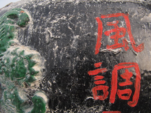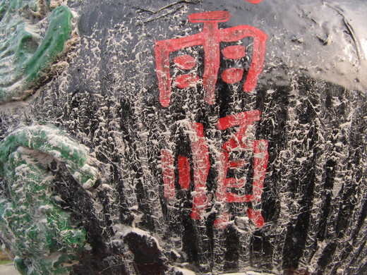 多少次又多少次--- 終於就在最近, 在附近另一處土地廟, 其香爐的爐灰被風吹落在爐身上, 經過雨水沖刷, 與陽光照射的交相作用, 竟然在其上書寫的"風調雨順"四個字之旁, 出現了戲劇性的畫面, "風調"---果真風和日麗, 大地蒼翠(如圖二); "雨順"---顯示出"雨洗涓涓淨,露沾綿綿意"的美麗畫面(如圖三), 不知道這是不是所謂的顯靈, 但確實至為奇妙---