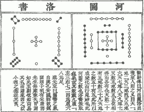 (2)河圖,洛書的關係。一般認為河圖為體,洛書為用;河圖主常,洛書主變;河圖重合,洛書重分;方圓相藏,陰陽相抱,相互為用,不可分割。漢代劉歆認為:「河圖洛書相為經緯。」(《漢書·五行志》注)南宋朱熹、蔡元定:「河圖主全,敵極於十;洛書主變,故極於九。」「河圖以五生數統五成數而同處於方,蓋揭其全以示人而道其常,數之體也。洛書以五奇數統四偶數而各居其所,蓋主於陽以統陰而肇其變,數之用也。」並認為河圖象天圓,其數為三,為奇;洛書象地方,其數為二,為偶。(《易學啟蒙》)蔡沉:「河圖體圓而用方,聖人以之而畫卦;洛書體方而用圓,聖人以之而敘疇。」並認為河圖主象、洛書主數;河圖主偶、洛書主奇;河圖主靜、洛書主動。(《洪範皇極·內篇》)清萬年淳以圖之方圓論河洛關係,認為:「河圖外方而內圓」,「中十點作圓布」,「外四圈分布四方,為方形,十包五在內,仍然圓中藏方,方中藏圓,陰中有陽,陽中有陰之妙也。而十五居中,即洛書縱橫皆十五之數,是又河圖包裹洛書之象。河圖點皆平鋪,無兩折,洛書亦然。」「洛書外圓而內方,圓者黑白共四十數,圓布精其外,包裹河圖之象。」「河圖已具洛書之體,洛書實有運用河圖之妙,因將圖書奇偶方圓交互表之以圖。」(《易拇》)近代杭辛齋認為:「河圖為體而中有用,洛書為用而中有體。」「有以圖書配八卦者,多拘執而不能悉當,其實河圖為體、洛書為用,河圖即先天,洛書即後天。」「故圖與書,相互表里,不能分割。」(《易楔》)還有人認為河圖重「合」,具有奇偶相配、陰陽互抱、生成相依的特點;洛書重「分」,具有奇偶分離,生成異位的特點,兩者一分一合,體現對立統