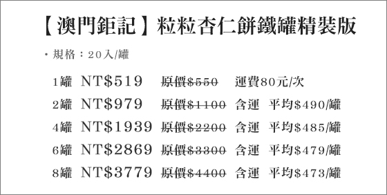 我買東西的習慣都會先上網查看看相關的資訊看到這個澳門鉅記-粒粒杏仁餅鐵罐精裝版好像不錯
