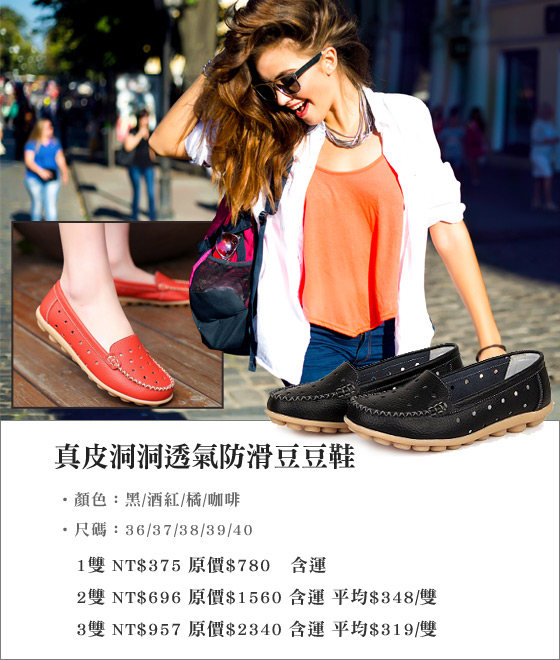 商品訊息簡述: 平均每雙最低只要319元起(含運)即可享有真皮洞洞透氣防滑豆豆鞋1雙/2雙/3雙,顏色:黑/酒紅/橘/咖啡,尺碼:36/37/38/39/40?