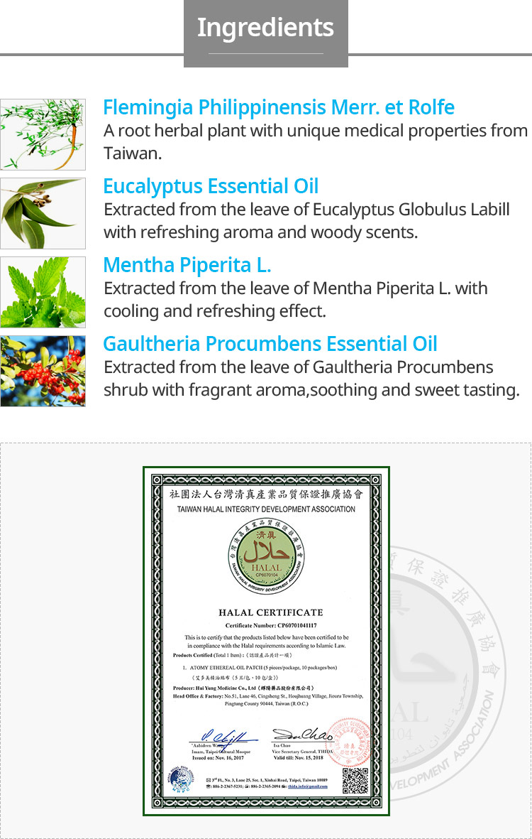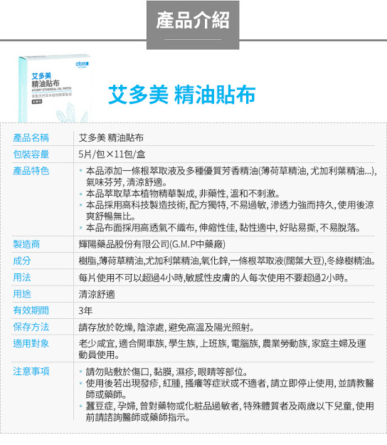 1. 成份皆為草本植物萃取精華,包含金門一條根萃取液、薄荷草精油、尤加利葉精油、冬綠樹精油,無西藥成份,温和不刺激,所以可長期使用,不會有藥性的副作用, 皮膚過敏的現象也會大大減低。不過, 敏感性皮膚的人, 建議可以在貼的地方先薄薄的塗上乳液, 再貼上貼布, 就可以減緩不適的情況發生了!