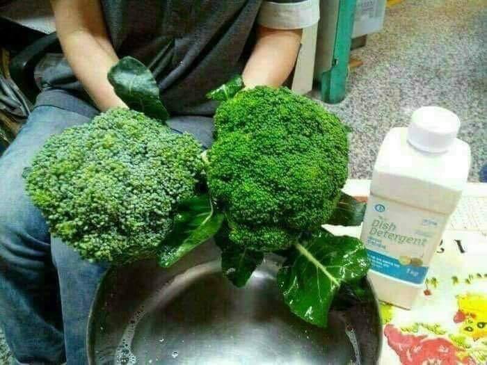 1)清洗前,因表面有農藥,青花菜會呈現暗綠;清洗後,青花菜立刻呈現自然的翠綠色。
