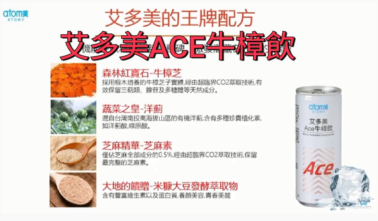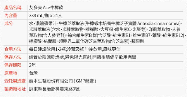 艾多美牛樟飲, 除了採用椴木培養的牛樟芝子實體之外, 還添加米糠配方、洋薊(以上2種為艾多美獨家配方)、人參皂苷、維他命B群、芝麻素。😮