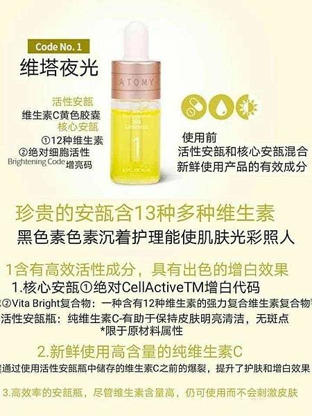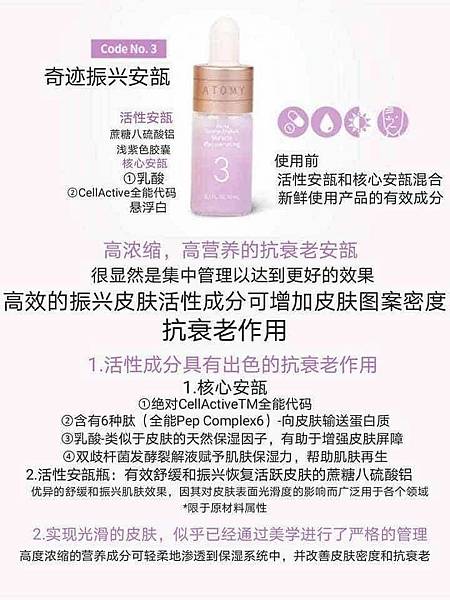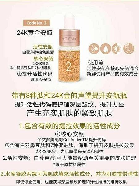 "艾多美全效安瓶分為主動型安瓶和核心型安瓶兩種,由四種高級安瓶“高級水合作用”,“維他發光”,“ 24K黃金注入”和“奇蹟再生”組成,可以在使用前立即混合使用。" 因為新鮮即是力量! 高活性成分在接觸到空氣後即自然開始氧化,因此新鮮時效果最強大。全效安瓶獨立密封包裝,將高活性成分隔離,使用時才予以活化,以期發揮最佳抗老化功效。