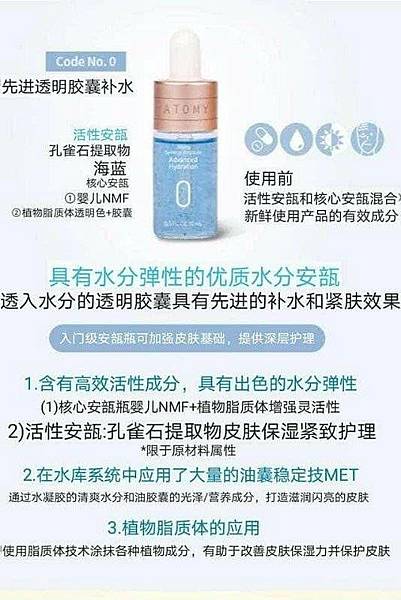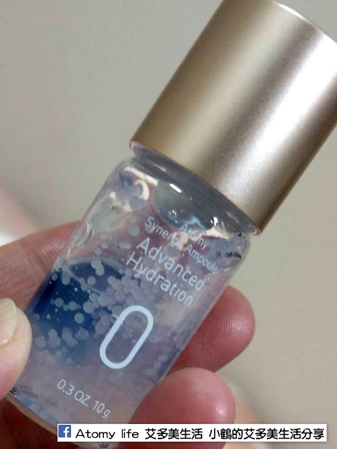 0號小藍瓶裏面的成分有一顆顆像小小的微脂囊, 滴在皮膚上, 經過按摩之後就不見了, 瞬間被皮膚吸收了, 整個皮膚就水嫩亮澤了起來喔!