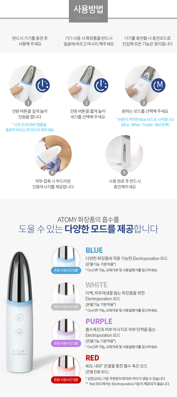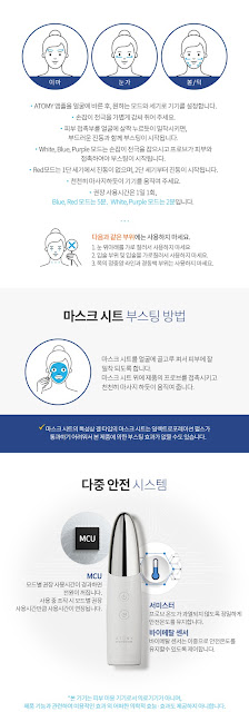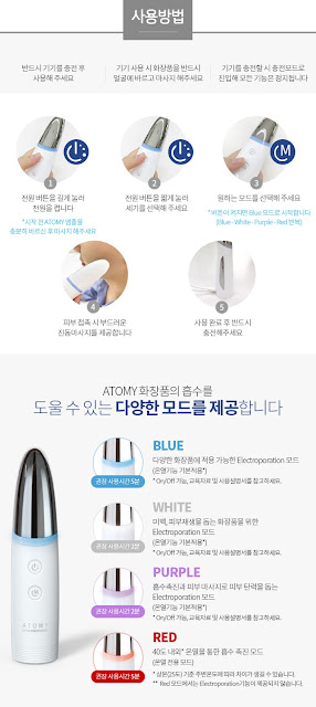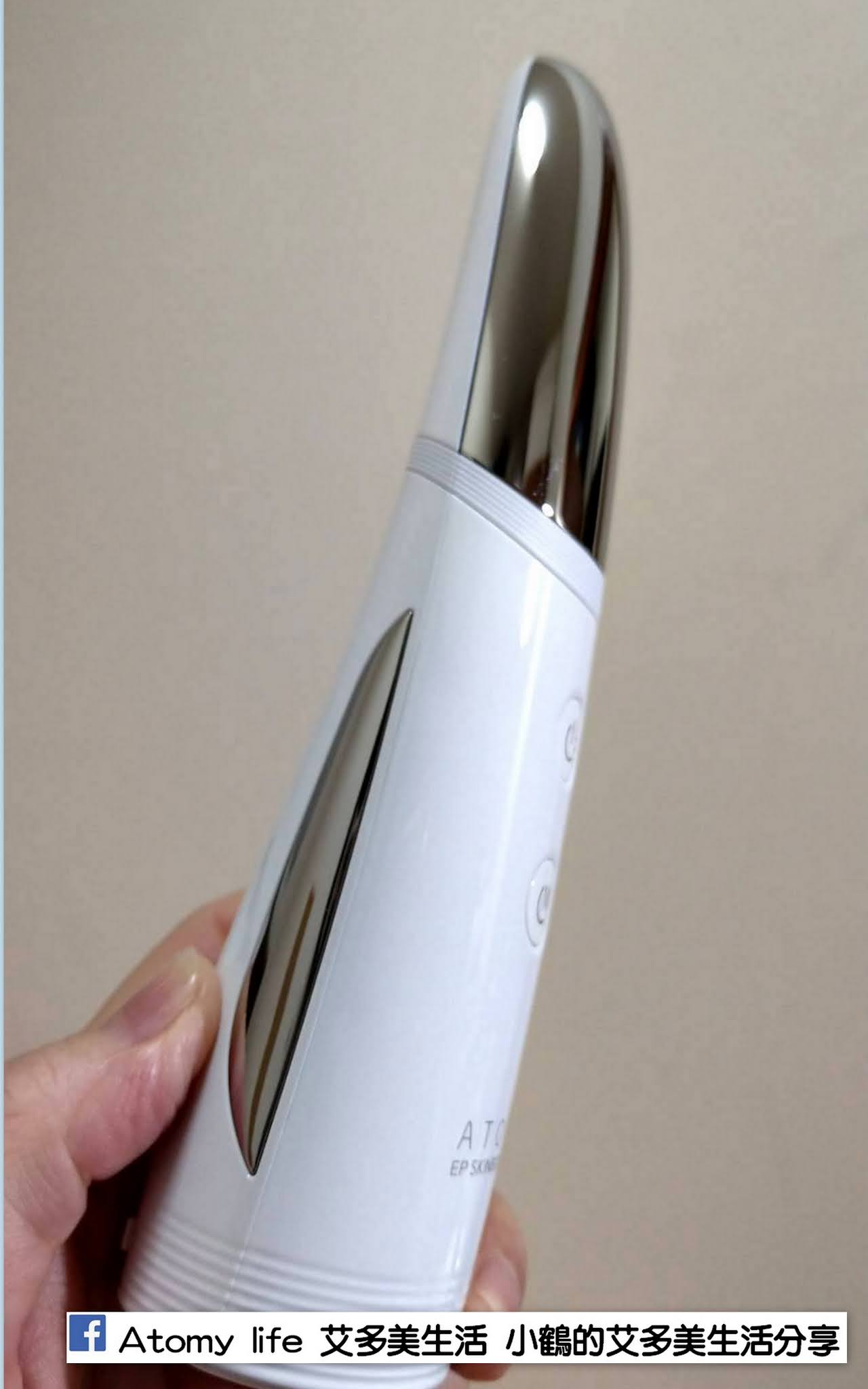 美容儀使用時有4個功能, 用顏色區分, 藍、白、粉、橘, 各有所長(請看以下說明), 還有3種強度, 使用時皮膚麻麻的, 有微熱感, 很大一支, 使用時就像是在幫皮膚按摩一樣, 很舒服, 做完真的讓我的皮膚變透亮了!