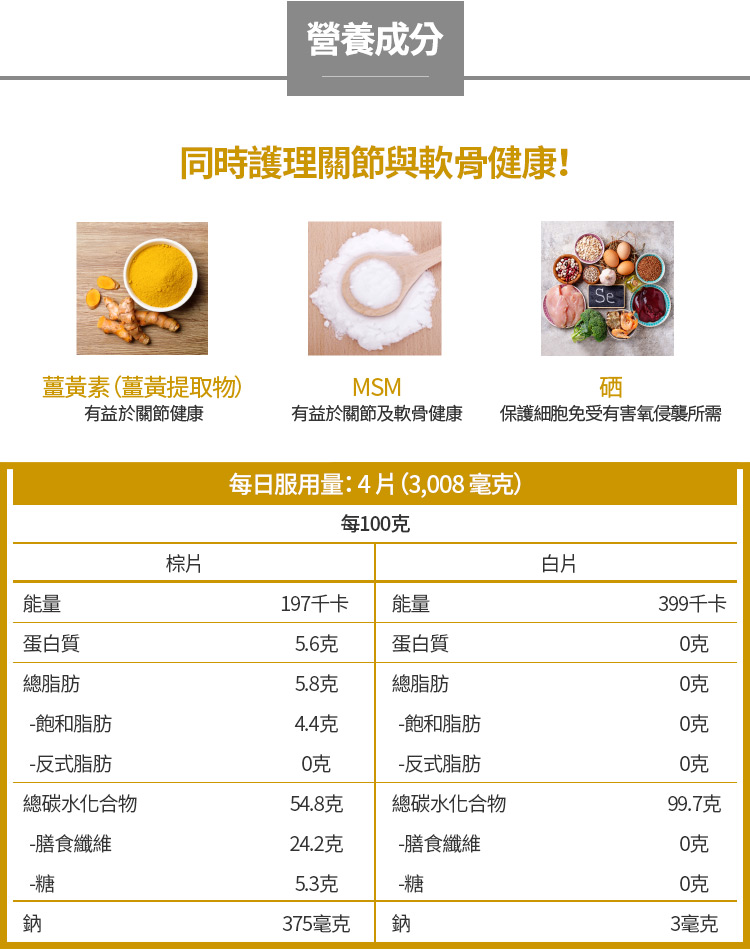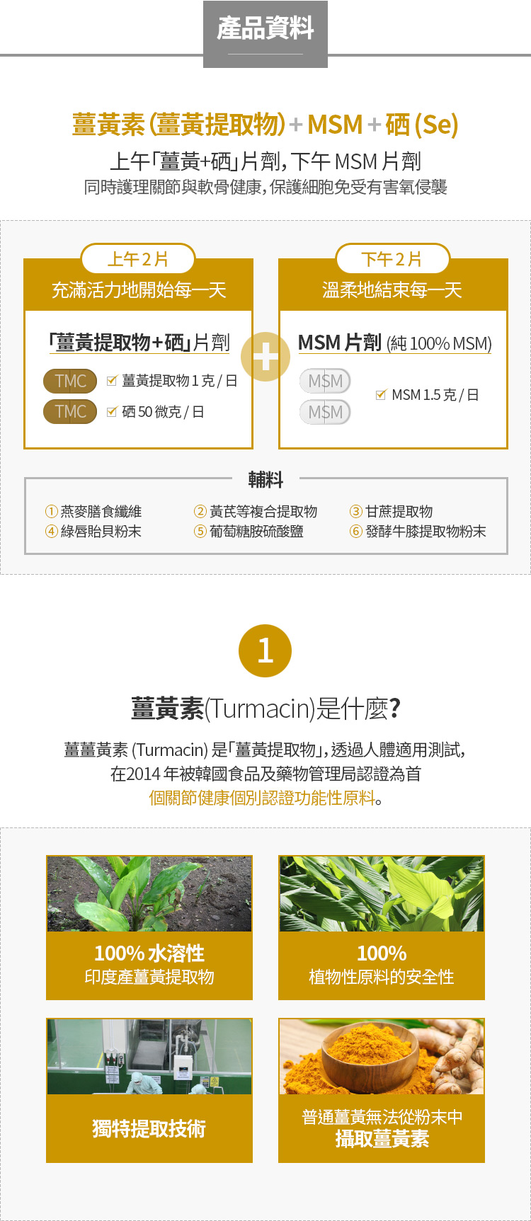 由三種主要成分組成: 薑黃素TURMACIN 、硒、MSM, 而且原料來源品質都是嚴選的世界級專利國際認証廠商, 消費者安心購買品質有保障!👍