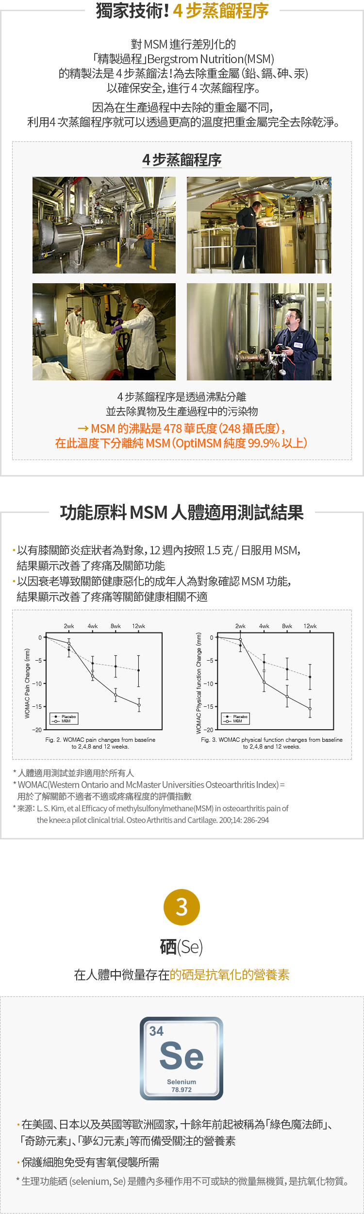 擁有超過25年MSM蒸餾技術經驗的熟練技術人員, 憑藉獨家的4蒸餾程序, 透過更高的温度把重金屬(鉛、鎘、砷、汞)完全除去, 以確保安全, 生產純度為99.9%的原料