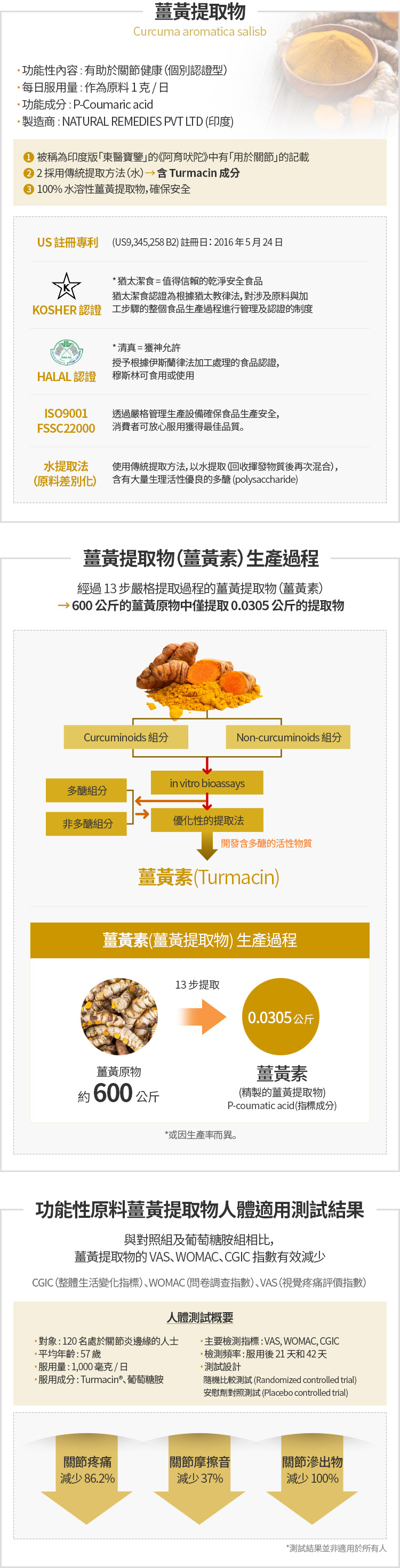 透過人體適用測試, 在2014年被韓國FDA認証為首個關節健康個別認証功能性原料。一般的薑黃粉是無法攝取到薑黄素(TURMACIN)的
