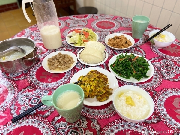 早餐:民宿中式早餐(地瓜稀飯,高麗菜,龍鬚菜,煎蛋,肉鬆,麵筋)+豆漿
