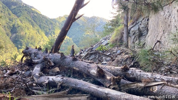 目前本林道9K處路基全部流失,需高繞上邊坡通過該區。