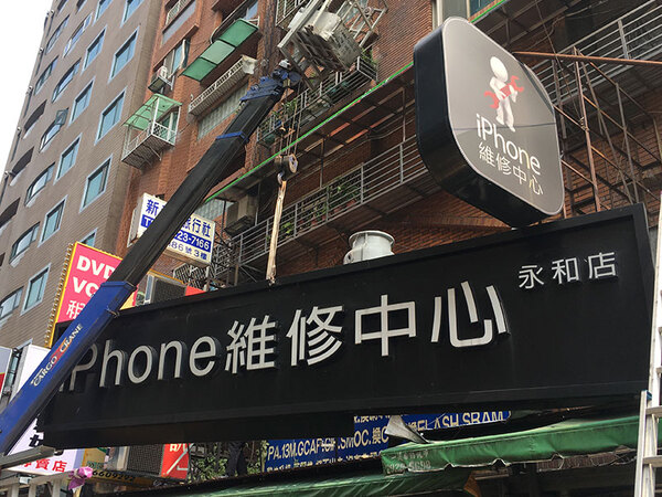 上個禮拜店裡的舊招牌突然壞掉,當時我正在舉辦通訊行的店面活動,客人多得很、生意超火爆,但是招牌壞了等於沒門面,所以我趕緊得找人解決