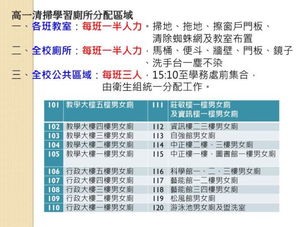把全校分為教室、全校廁所及公共區域三部分
