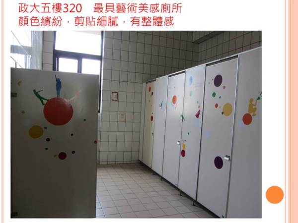 最有藝術美感的廁所是政大五樓320! 顏色繽紛、剪貼細膩、從入口、洗手台到牆壁門板整體設計。竟然讓其中一位評審給了99高分!!