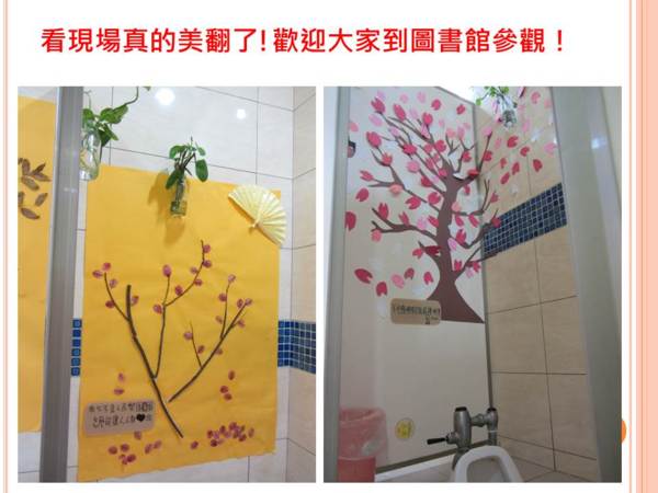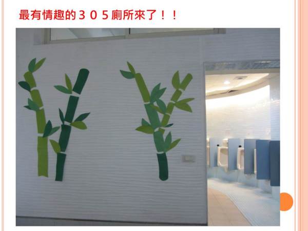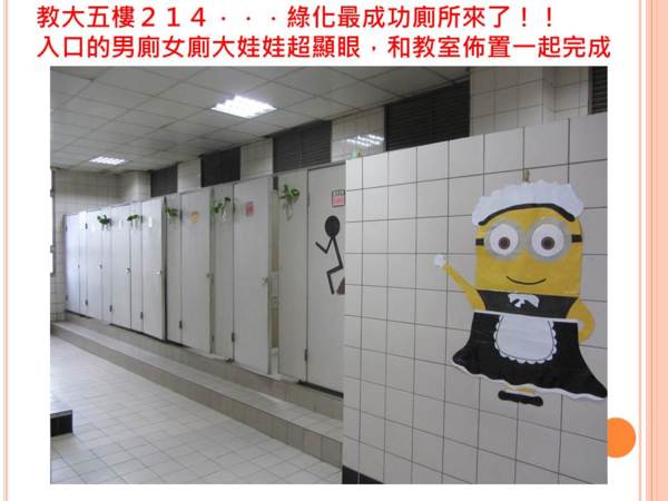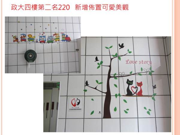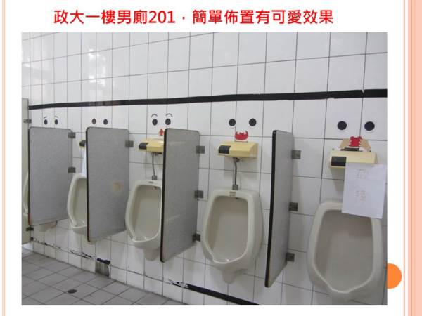 政大四樓220廁所除了原有佈置,有廁所文學,還新添了佈置和綠化盆栽,讓人哇哇哇! 政大一樓男廁的小黑臉超可愛! 許多班級在廁所內間都設有文章或笑話,整潔度都尚可,但洗手台、洗拖把處,及天花板蜘蛛網則待加強。