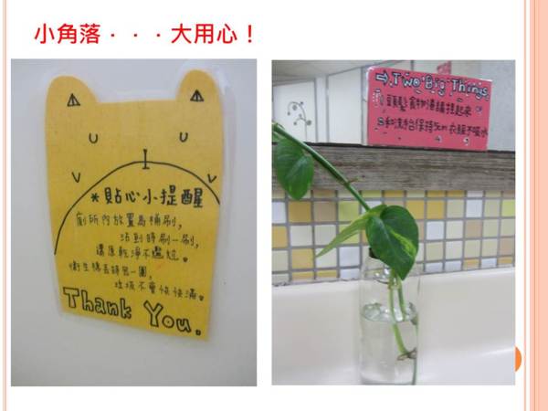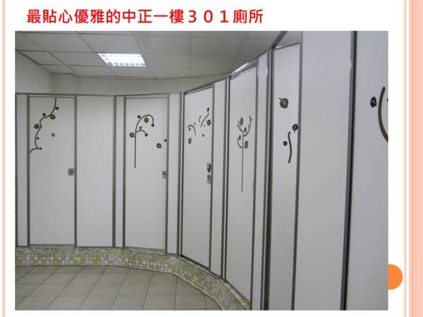 最貼心的廁所是中正一樓301,擺飾、標語、佈置都讓人感到窩心。