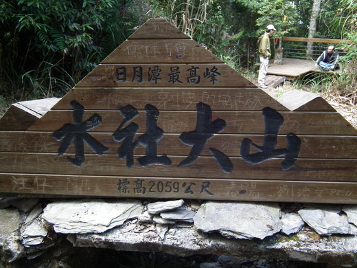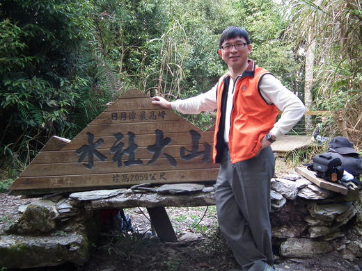 好不容易上到山頂三角點,當然是拍照留念,但是煞風景的是「水社大山」木牌上被刻了好多「到此一遊」的名字,有個仁兄生氣了,也在木牌上刻「刻字的人是垃圾!」,我們一行人看了都捧腹大笑…