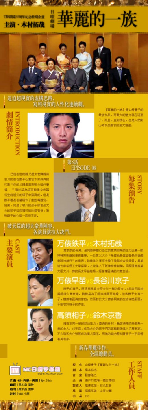 不管是作為書寫者,還是讀者,看到一篇關於2007年日劇《華麗一族》的文字,第一個浮現的念頭應該會是這個問題:為什麼是《華麗一族》?這齣雖然是大卡司大製作,原著劇本還是《白色巨塔》的作者山崎豐子,但持平而論並不算太好看,標準嚴格點的話,只能算中上水準,而且都一年過去了,為什麼現在還要寫/讀這麼篇文字呢?甚至,為什麼不寫《白色巨塔》呢?