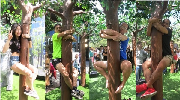 這是10月1日,在台北信義區出現的奇特景觀,有人一邊環抱樹幹,一邊笑容滿面;有人是乾脆整個緊貼大樹,彷彿吸收著大樹靈氣。吸引眾多民眾圍觀;但這不是在拍電影,而是一場前所未有的徵才活動:「倍潔雅CEO徵求員工至澳洲顧樹」。
