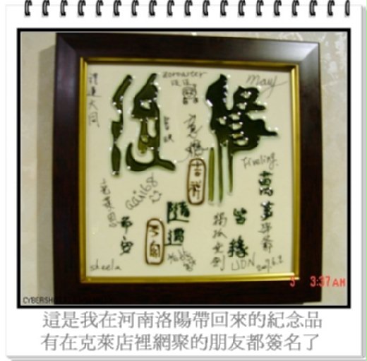 臨行前 所有網趴的朋友在Fiveling拿出的紀念品上簽名 然後將此物送給客萊恩 掛在店裡作留念 如果看官您有去店裡 可以尋問此物何處尋 老闆會給您折扣喔~!