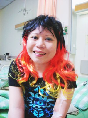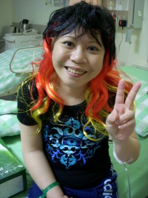 學蔓氣色還好,初進病房時學蔓可倫樹心情太Hi了、喘個不停、也興奮滴說不出話來…(偶們一行人運氣懷不錯算,她才剛抽完肺積水不久。)
