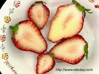 我們從外觀查看,果然花萼向上捲曲,頂部顏色偏白,切開草莓一看,大草莓個頭大,裡頭卻出現空心,表皮比較薄,吃起來果香沒有那麼濃,花大錢好像當了冤大頭。