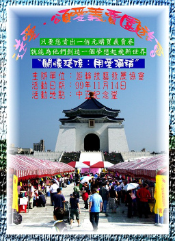 「炬輪技藝發展協會」(原中華民國殘障技能發展協會)一年一度籌募身心障礙朋友技能訓練與活動經費愛心義賣園遊會,又要在「台北市中正紀念堂-自由廣場」舉辦了!