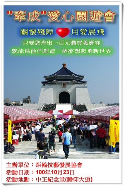 炬輪技藝發展協會(原中華民國殘障技能發展協會)為籌募身心障礙者技能訓練.職種開發及活動經費,一年一度舉辦愛心園遊會,於100年10月23日,舉辦「牽成」愛心園遊會暨身心障礙者才藝展演活動。