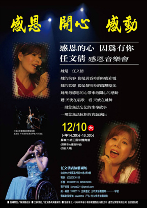 任文倩是獲得今年輪椅標準舞比賽冠軍隊伍的成員之一。為能邊讀書邊治療身體障礙,任文倩從國小到國中都住在屏東基督教醫院,接著就讀實踐家專,畢業後開設服裝設計工作室,並和身障朋友組成表演團體,以歌聲及舞蹈鼓勵其他陷於情緒低谷的朋友,因此獲頒十大傑出菁英獎。