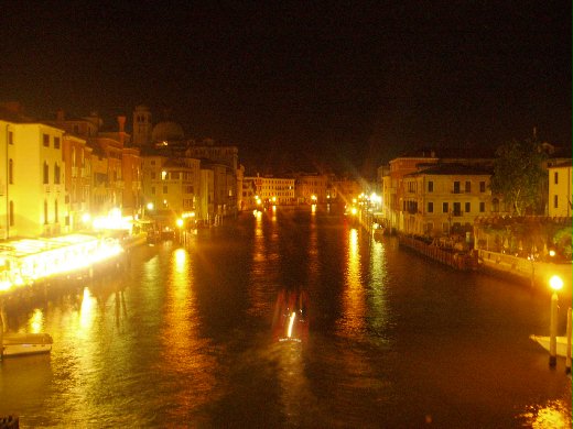 大運河邊的餐廳在月夜升起時,暈黃的燈火把運河照的繽紛無比。岸邊情侶們依偎,互訴情語。我則是一人佇立在Ponte Scalzi上,享受著地中海吹來夏夜的涼風,細細品嚐著真正的生活。