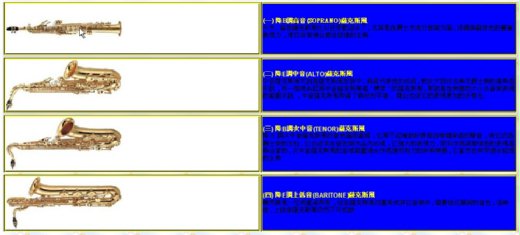 所有薩克斯風都可作獨立演奏。薩克斯風家族中最常見的有4種,分別是Bb高音管,Eb中音管,Bb次中音管及Eb低音管,而完整的薩克斯風家族是有8種不同型號的,其餘4種較為罕見。