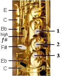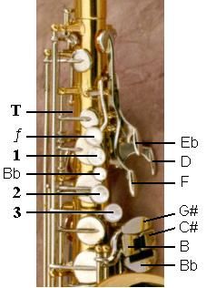Left Hand Main Keys1   · First Finger Key (B) 2   · Second Finger Key (A/C) 3   · Third Finger Key (G) f   · Front F Key The Front F key is the topmost left hand key and is pressed by the first finger. It was designed to provide an altissimo fingering for F6 as an alternate to using the palm keys. The key is used for various other altissimo fingerings as well. Bb   · Bb (Bis) Key The Bb key is pressed by the first finger to play first– or second–octave Bb in passages without B–naturals. It is located between the main keys for the first and second fingers.