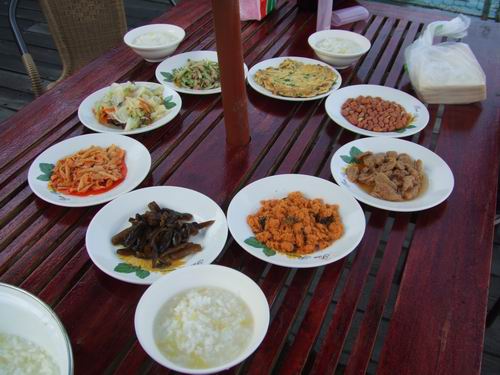 當陽光輕輕灑下, 湖面上嬝繞的水霧緩緩散去, 眾人漸次醒來, 女主人早已準備好一桌豐盛的地瓜稀飯和小菜了. 當接駁的遊艇來接我們時, 心中湧起一股不捨, 或許, 中秋再來此賞月吧!