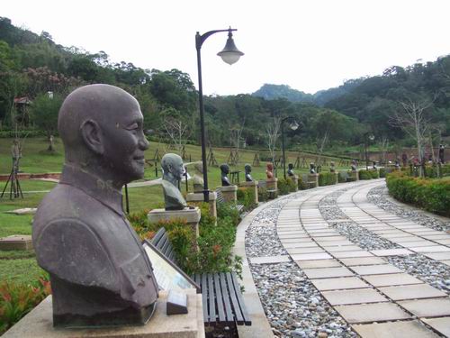 路上人車少得不像過年, 因為車行太順暢, 倏忽就離開了大溪市區, 本想去老街參訪參訪, 卻已走上台7, 就沿路慢慢玩吧! 煙雨中, 連角板山也錯過了, 直接到了慈湖, 空蕩蕩沒有什麼人, 爬過拱橋被草坪上星羅棋布的銅像給震住了!!