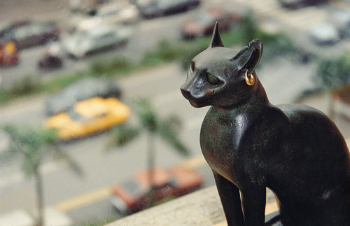 一九八九年,我到歐洲旅遊,倫敦的「大英博物館」當然是首要重點。當時剛好展出轟動考古界的埃及剛出土的法老木乃伊,來自全世界的遊客非常多,我有幸公逢其盛。在相關的埃及墓葬文化活動展出中,除了人之外,還有動物的墓葬,其中,令我嘆為觀止的是,各種動物都綜合的集中在一起,「貓」則有一個專門的獨立大房間展出,裡面有好幾具貓木乃伊,貓頭之外,身體用各種花色的亞麻布綑綁,長度與人類一般的大小,貓的內臟與腦各安放在陶瓷罐子內,還有埋葬的棺木等等,可見貓與埃及人的生生世世,是多麼的緊密與悠遠留長。