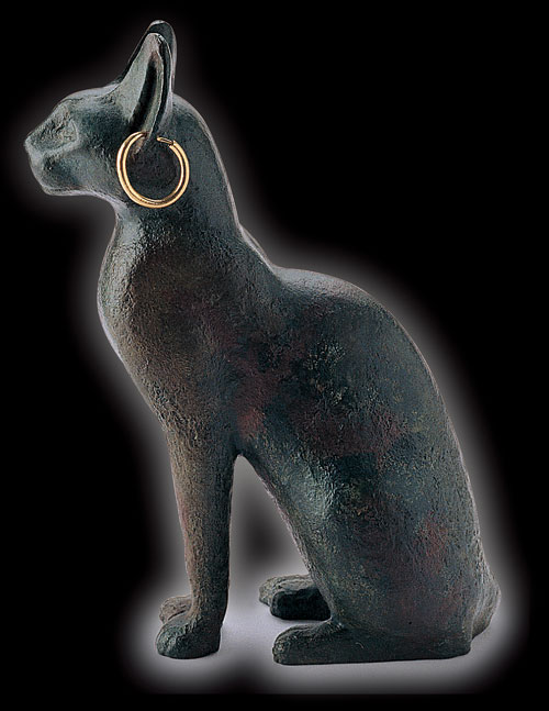 神貓的坐姿,是正面蹲立,後肢貼地,前肢像日本人雙手緊貼在遢遢米上的恭敬之姿,尾巴剛好繞到前肢的足趾端。兩眼平視,兩耳都穿了耳洞,原本穿戴的一般金屬耳環,我拆下換成我的黃金耳環。