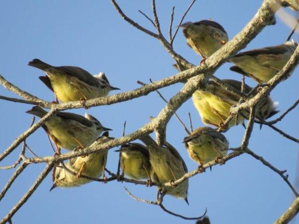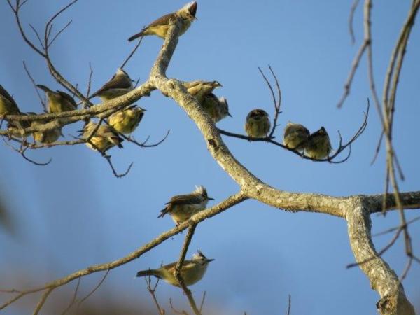 碼頭樹上聚集一群冠羽畫眉鳥,它們齊飛齊降落,超有默契!