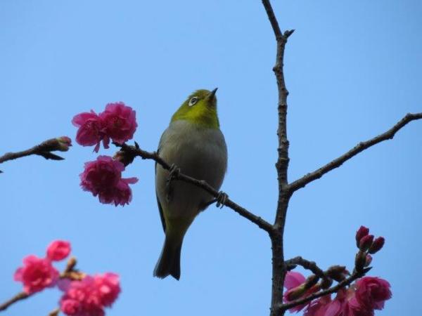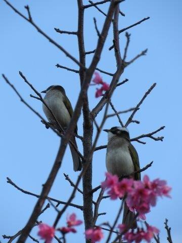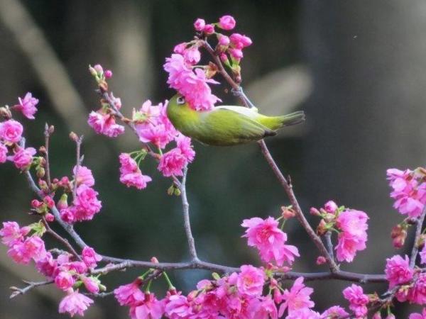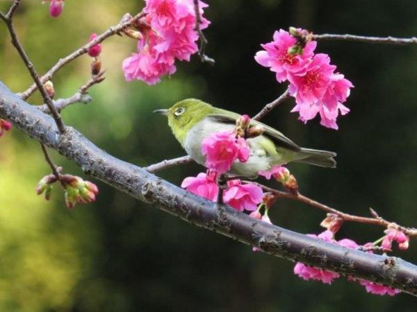 開五成的八重櫻,依舊吸引綠繡眼成群在樹上覓食飛躍
