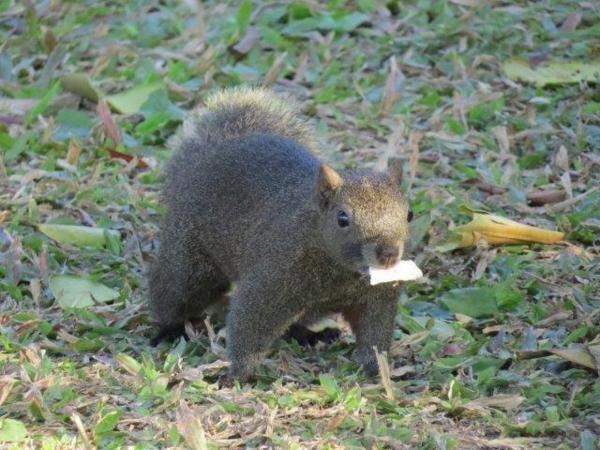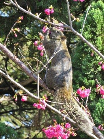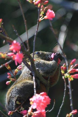 令人想不到是松鼠,它強佔優勢,不僅在草坪上活躍,還上樹趕鳥採花吃